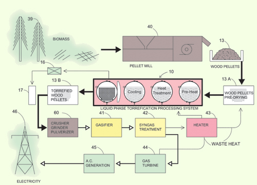 The CNFbiofuel™ system uses a new patented Liquid Immersion Torrefication Processing Technology. This uses “Conduction” heat treatment of wood pellets in multiple stages of heat transfer fluid. This process puts over 1000 times as many molecules in direct contact with the wood surface as compared to the prior art “Convection” heat treatment in a gas or steam process.
